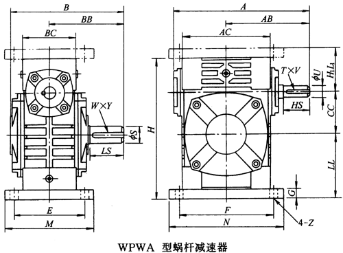 WPWA40、WPWA50、WPWA60、WPWA70、WPWA80、WPWA100、WPWA120、WPWA135、WPWA155、WPWA175、WPWA200、WPWA250、型蝸輪蝸桿減速器主要尺寸