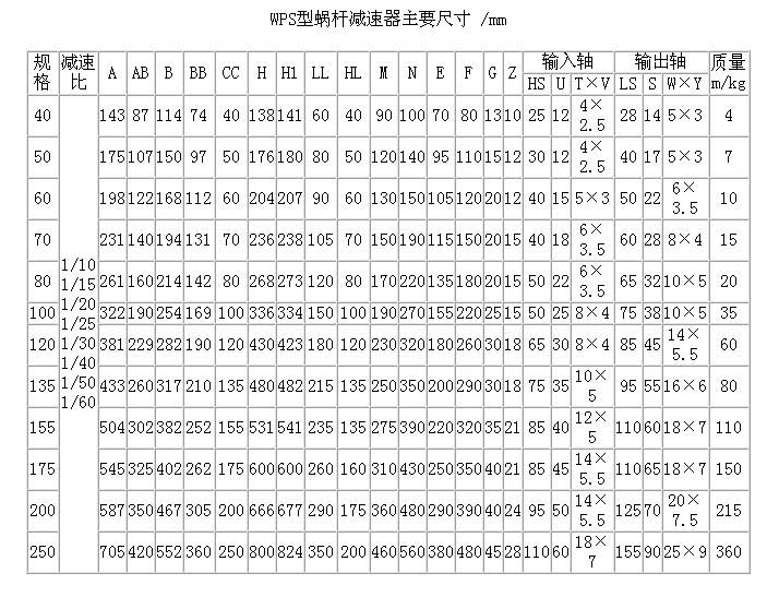 WPS40、WPS50、WPS60、WPS70、WPS80、WPS100、WPS120、WPS135、WPS155、WPS175、WPS200、WPS250、型蝸輪蝸桿減速器主要尺寸